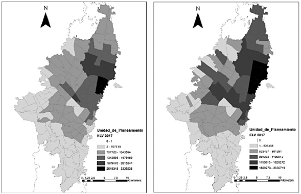 The maps in Figure 5 display the hypothetical lease value (left) and the effective lease value (right) from the information in the Encuesta Multipropósito (2017). Both maps indicate that the higher lease values at the level of Unidades de Planeación Zonal (UPZ)3 were in the north-eastern part of the city. The lower lease values were distributed in the periphery: predominantly the south and west.
