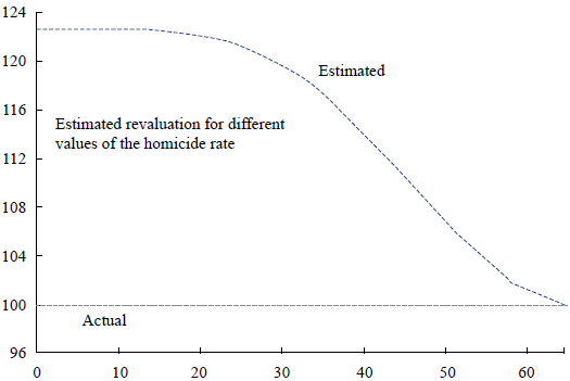 With the estimated coefficients, the increase in housing prices when the homicide rate diminishes can be simulated. In Figure 7, the horizontal axis measures the homicide rate, while the vertical axis indicates the average (percentage) increase of a housing prices index. In this graph, 100 is the observed value of the housing prices for the actual homicide rate of 64.45. As the graph shows, when the homicide rate is "zero", the estimated real estate value (property value in the form of land and buildings) reaches 122.64- a 22.64% increase-which can be interpreted as an increase in people's welfare.