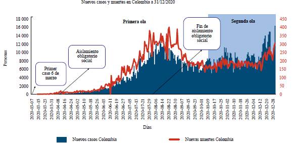 Figura 1 Evolución de nuevos casos y muertes diarias por COVID-19 en Colombia en 2020