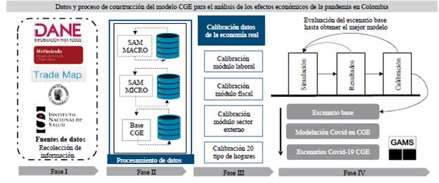 A ello se sumó, de forma simultánea, el shock petrolero, la caída esperada tanto en la inversión extranjera directa (IED), las remesas, el uso de la capacidad instalada y el incremento del gasto público del Gobierno, dirigido a implementar medidas de mitigación y recuperación de la actividad económica y social, fuertemente vulnerados por los efectos de la pandemia, lo que se explica detalladamente en la siguiente sección. La Figura 2 resume la metodología seguida para la calibración, modelación y simulación de escenarios con el modelo CGE utilizado en el presente trabajo.
