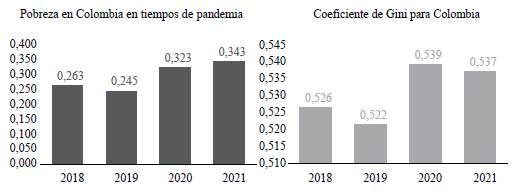 Se encontró que la pobreza en Colombia, medida con la metodología vigente en 2018, se incrementó por efecto de la pandemia en cerca de ocho puntos porcentuales, con incrementos adicionales en 2021 por los estragos socioeconómicos de la pandemia y las medidas para enfrentarla. Desde el punto de vista de la distribución de los ingresos, el coeficiente de Gini para la economía colombiana empeoró. El mercado laboral se frenó y afectó negativamente, aunque el aumento de la tasa de desempleo se mitigó por el retiro transitorio de algunas personas desempleadas de la población económicamente activa (PEA).