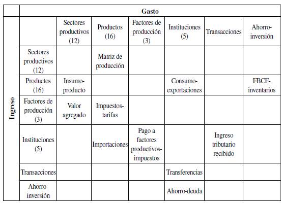 En este orden de ideas, la matriz identifica claramente los flujos de ingresos y gastos asociados a cada uno de los doce sectores productivos, los dieciséis tipos de productos que generan, los cinco agentes que interactúan en la economía (hogares, empresas, gobierno central, gobierno descentralizado y el resto del mundo) y los tres factores de producción (mano de obra cualificada, mano de obra no cualificada y capital).