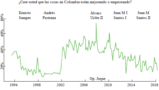 Entre 1994 y 1998, se advierte una caída en la percepción de mejoría por parte de los encuestados. Ello podría explicar por qué, en 1998, los electores votaron por el partido político tradicional contrario al de Ernesto Samper. A su vez, durante el gobierno comprendido entre 1998 y 2002, se evidencia, de manera constante, una percepción poco optimista sobre una posible mejoría de la situación general del país y, al igual que en el periodo anterior, no hubo continuidad en el poder por parte del Partido Conservador Colombiano.