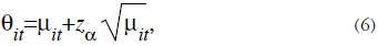 donde z a es el a-ésimo cuantil de la distribución normal (es decir F(zα) = α), para la cuál existen algoritmos eficientes de cálculo (ver por ejemplo [1]), y está disponible en paquetes comerciales como Excel. La ecuación (6) recomienda que la oferta de servicio sea igual a la demanda esperada más un factor de seguridad. Al derivar la ecuación (6) Riaño supone que el proceso de demanda es mucho más variable que el proceso de arribo de los buses. Si éste no es el caso, se puede utilizar un valor de a más alto, para que haya un exceso de capacidad.
