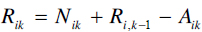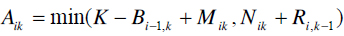 Rik, representan demanda para el siguiente bus. La demanda potencial total para el bus k es, por lo tanto Nik + Ri, k-1. Si llamamos Mik el número de pasajeros que bajan en i, tenemos que la capacidad remanente del bus es K - Bi - 1, k + Mik. Por lo tanto el número de pasajeros que sube al bus es