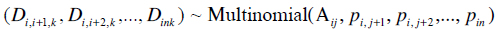 Llamaremos Dijk el número de pasajeros que toman el bus k en la estación i con destino j (se adopta la convención Diik =0). La distribución conjunta de los Dijk, dado que suben Aij pasajeros al bus, es multinomial
