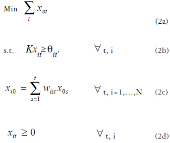 En la Figura 1 puede verse el modelo completo desarrollado hasta ahora. La función objetivo (2a) es el número total de buses despachados durante el día, (2b) garantiza que la demanda sea satisfecha, (2c) describe la transformación entre las tasas de despacho y las observadas en cada estación de la ruta y finalmente (2d) garantiza que las tasas de despacho no sean negativas. Debe notarse que se trata de un modelo lineal continuo y por lo tanto su solución es sencilla usando paquetes de programación lineal comerciales. En la siguiente subsección explicamos cómo se calculan los pesos Wist a partir de la dinámica de movimiento de buses en el sistema, mientras que en 1.2 explicamos cómo se calcula θit a partir de la restricción de servicio. Una vez se tienen las frecuencias x0t para cada periodo, hay técnicas estándar que describimos en 1.3, para establecer el horario de despacho de cada bus.