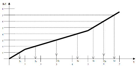 En esta sección describimos cómo construir el horario específico de envío de los buses a partir de las frecuencias x0t que arroja el programa lineal (2). La técnica propuesta a continuación no es nueva y se usa para construir un horario también en otros métodos que arrojan frecuencias [5]. Construimos una función X(τ) continua, lineal a trozos, tal que la pendiente en el intervalo t sea igual a la frecuencia de despacho x0t. Esta función puede interpretarse como el valor esperado de buses que han sido despachados hasta el instante τ (ver Figura 2). La función X(τ) es estrictamente monótona y, por lo tanto, tiene una inversa. La hora de salida del bus k, Sk, se escoge garantizando que X(Sk) = k, es decir Sk = X-1k. Como la función es lineal a trozos, no es difícil construir un algoritmo para calcular de manera explícita esta inversa. Referimos al lector a [5] para ver los detalles.
