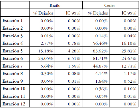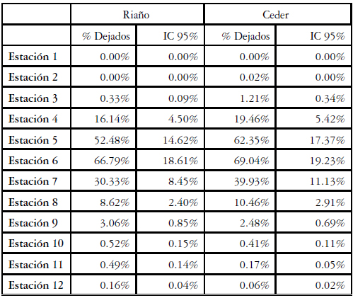 Tabla 2: Resultado de 100 replicaciones de la simulación con el escenario de perfil decreciente. Llegan más personas a la primera estación y decrece linealmente. Se muestra el porcentaje de personas que no pueden tomar el primer bus junto con el intervalo de confianza del 95% para los métodos de Riaño y Ceder.
