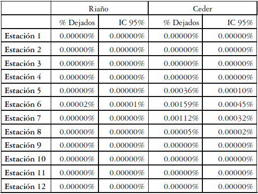 Para cada escenario se corrieron 100 replicaciones de la simulación y se calculó el porcentaje de personas que no lograron subir al bus cada vez que llegaba a la estación, para cada estación y para la totalidad. En las Tablas 1 - 3 se pueden ver los resultados de estas simulaciones. Puede verse que al usar el método de Riaño el porcentaje de usuarios que no logran subir al bus es menor, usando exactamente el mismo número de buses, estableciéndose así, que, por lo menos para los escenarios estudiados, tal método domina al usado tradicionalmente.