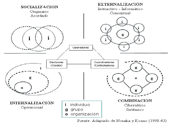 Esta consideración de la dimensión informática en las organizaciones, sin embargo, discurre en el dilema de optimización y materialización real, entendiendo que suscita un interés particular por la racionalización de la toma de decisiones (aun con información defectuosa: incompleta, imprecisa, o desaprovechada), en torno a la generación y distribución de la información y el conocimiento como "bienes colectivos" [15]. De hecho, la capacidad orgánica de acumular y "procesar" el conocimiento organizacional está concretada por Nonaka [16] a partir de la diseminación colectiva y su materialización en productos, servicios y sistemas, es decir, nuevas formas que replican conocimiento e información.