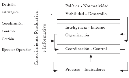 Desde otra perspectiva, al interior de la organización, la visión de LeMoigne [18] distingue funcionalmente 3 unidades: inteligencia y decisión, coordinación y control, información y operación. La complejidad del modelo construido hasta el momento ha avanzado, de esta manera, en la concreción de un modelo ciber- nético (Figura 3) compuesto por diferentes unidades recursivas alineadas a partir de la implantación de 3 estratos organizacionales: político (facilitador), inteligente (estratégico) y controlador (regulador del desempeño); a partir de estos estratos se corresponden 3 niveles de conocimiento: productivo (control), táctico (coordinación), y estratégico (integración).