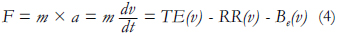 La fuerza necesaria para mover un vehículo de tracción es igual a la MT del vehículo por la aceleración (a). Esto es equivalente a la diferencia entre el esfuerzo de tracción TE(v), la resistencia al movimiento RR(v) y el esfuerzo de frenado Be(v), así: