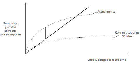 Como variable horizontal, la Figura 1 muestra el nivel de uso del lobby, abogados o soborno; en la vertical, muestra los beneficios y los costos para el renegociador. Las curvas representan el valor esperado de los beneficios de ganar un pleito o una renegociación con lobby, abogados o soborno; las líneas rectas representan los costos para el renegociador. La flecha vertical representa la máxima ganancia que se extraería, es decir, el nivel óptimo del uso del lobby, de abogados o de soborno. Lo anterior correspondería, en la curva "Actualmente", a la actuación de un Estado débil. Puede verse que un esquema de fortalecimiento institucional debería actuar reduciendo los beneficios por renegociar, de forma que la curva de beneficios y costos nunca se corten o se corten muy abajo. Ése sería el mejor esquema con la curva de abajo "Con instituciones sólidas".