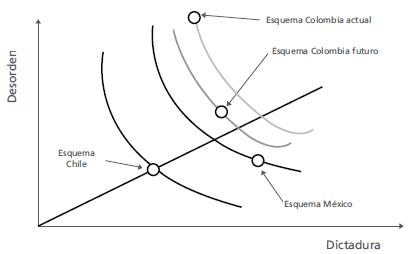 La Figura 2 muestra gráficas adaptadas al contexto colombiano. En la variable horizontal está presente el grado de "dictadura" y en la vertical, el grado de "desorden". Vemos ahí cuatro curvas cóncavas hacia el origen. Son el lugar geométrico de las instituciones de un país. En el caso sectorial, entre más cerca se encuentre un país del origen tendrá un mayor capital cívico, menor "dictadura" y menor desorden. El esquema chileno de concesiones podría ubicarse en la curva más cercana al origen. México tiene menos capital cívico y está más hacia el noreste; su esquema tiene, en términos de proporción, más participación publica y menos participación privada. El esquema colombiano está en la última curva, pues es muy desordenado y cuenta con una participación relativamente baja del Estado, comparado con el esquema mexicano, pero mayor que el chileno.