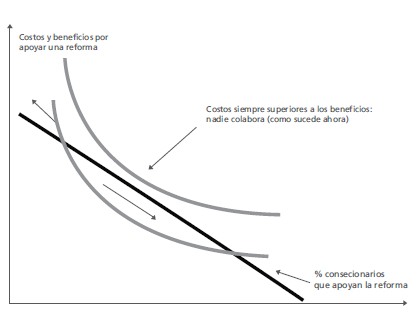 Otra manera de ver la reforma del sector es entenderla como una reforma basada en liderazgo político. En la Figura 4, las curvas representan los costos y la línea recta, los beneficios por apoyar una reforma para un individuo; en la horizontal está el porcentaje de concesionarios que apoyan una reforma. ¿Qué tenemos actualmente? Una diagonal de beneficios para un concesionario y una curva por encima que nunca la corta. Así pues, los costos y los beneficios no se cortan y, por tanto, no le conviene a un concesionario sumarse a una reforma o apoyarla. Si el gobierno logra reducir los costos, esa curva se baja y hay dos puntos de corte; el equilibrio es el punto de corte de la derecha, en el cual un alto porcentaje de los concesionarios estarían dispuestos a apoyar una reforma.