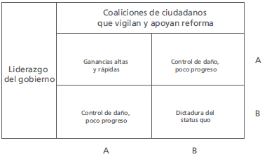 Por último, la reforma puede entenderse como un problema de coordinación entre la sociedad civil y el gobierno. En la Figura 5, se muestran las posibles salidas cuando existe un liderazgo del gobierno alto o bajo, y unas coaliciones de ciudadanos que apoyan la reforma de manera alta o baja. Dependiendo de lo que haga cada uno de los dos grupos de actores, se pueden tener unas ganancias altas y rápidas, o no. Para que lo primero ocurra, es importante que la reforma se ubique en la esquina izquierda superior. Una dictadura del status quo, en la que ni el Estado ni los ciudadanos están dispuestos a dirigir sus intereses y sus acciones en una sola vía, se ubicaría en la esquina derecha inferior. Si sólo uno de los dos actores trabaja a favor y el otro no, sólo se lograría un control del daño con poco progreso en los esquemas de concesiones.