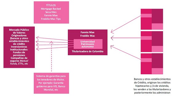 - Los bancos venden la cartera a una entidad titularizadora (por ejemplo, Fannie Mae en los Estados Unidos o la Titularizadora de Colombia en el caso colombiano).