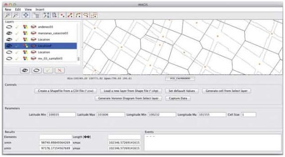 The data entry step reads the GIS data containing the required information, using an open source GIS processing API, GEOTOOLS [5]. GEOTOOLS opens GIS files and manipulates their data as a Java collection. After loading the required files, the data processing step transforms the original GIS data to generate the nodes for creating the Voronoi diagram and the zones are structured into Voronoi polygons and finally, specialized objects are created to contain the processed data. Some basic operations such as data format conversions, concatenation, grouping or relating are necessary for data processing. Fig. 1 shows the data processing application in action, after dividing the urban space in Voronoi polygons. Finally, in the data persistence step, the generated objects are persisted using the DBMS MySQL.