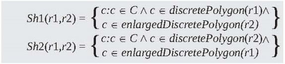 C∧(∃r c∈discretePolyg(r)∨distEPPol(center(c),r)<D))}. E is not a partition of C. Each element of E is a discrete polygon related to an element of R. This defines the bijective function enlargedDiscretePolygon(r) that returns the corresponding element from E.