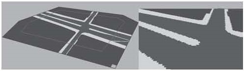We are developing an urban traffic microsimulator in order to introduce psychological traits and other behavior patterns in mobile agents; for example, motor vehicles and pedestrians. Microsimulations are computationally expensive because they simulate a great quantity of agents, so an adequate space partitioning method is required for the distribution of each space partition to available processors [6]. Therefore, our urban model is useful for these kinds of simulations. Each Voronoi polygon and its related agents may be processed by a different CPU. Microsimulations involve dynamic elements known as agents; each of these agent needs to know its position and its surroundings in order to calculate each step in the simulation. To facilitate this a discrete Voroni polygon is used which generates a series of equal-sized square partitions known as cells. Each cell contains information about overlapping zones, signs and mobile actors. Fig. 3 shows a Voronoi Polygon with information relating to blocks and streets. It also shows the discrete partitioning in cells 0.5 meters wide.