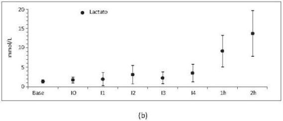 Se observó alcalosis marcada presente durante los 4 niveles de intercambio (I1-I4) secundaria a la hiperventilación que posteriormente cae durante las 2 horas después de I4 (figura 9a). En las fases finales (1h-2h) se presentó acidosis metabólica (figura 9b) secundaria a la hipoxia tisular.