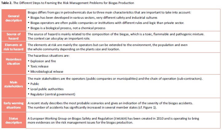 La producción del biogás se ha posicionado como energía que no solamente genera un recurso de energía renovable sino también que recicla desperdicio. En el contexto del desarrollo sostenible, el lugar del biogás es por lo tanto esencial. Algunas preguntas de temas de seguridad como la armonización de las regulaciones y la necesidad de desarrollar estándares se discutirán en este texto basados en los resultados del taller sobre la seguridad del biogás y las regulaciones organizado en noviembre del 2010 y las actividades del grupo de trabajo europeo sobre la seguridad del biogás y la regulación creada después del taller. Los riesgos correspondientes a la producción del biogás y su uso han sido enmarcados usando el método y las herramientas iNTeg-Risk. Varios déficits para el manejo de riesgo han sido identificados y, a su vez, el grupo de trabajo presenta una estrategia para mejorar la gestión de riesgos al final de este trabajo.