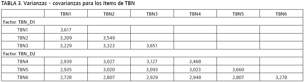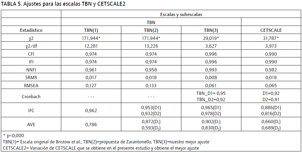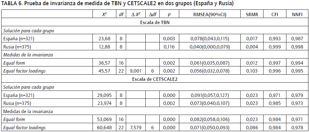 Los indicadores de ajuste siguen siendo adecuados (Tabla 6), concluyendo que tanto la escala de TBN como la de CETSCALE2 son suficientemente invariantes.