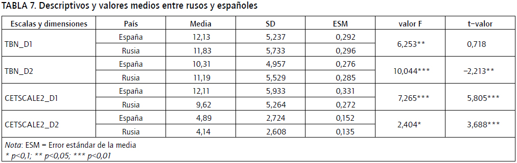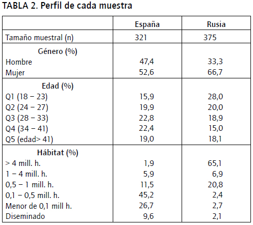 La Tabla 2 muestra los perfiles de las muestras finales para cada país. Ambas tienden a estar compuestas por personas jóvenes, al ser la edad media de 33,5 años (española) y 31,3 (rusa) cuya diferencia en términos absolutos no es relevante (2,2 años).
