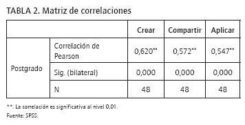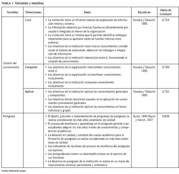 Cabe señalar que cada una de las variables y dimensiones, es decir, postgrado, crear, compartir y aplicar conocimiento, está construida en base al promedio de los ítems que se indican en la Tabla 1. Cada uno de estos ítems fue medido con una escala Likert de 1 a 7.