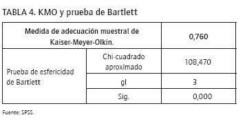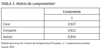 También cabe destacar que el análisis es posible de utilizar, ya que la prueba de KMO indica que existe una correlación moderada entre dimensiones incorporadas en el modelo (KMO 0,760; p < 0,01). Es decir, las acciones de crear, compartir y aplicar conocimiento, se encuentran interrelacionadas en el proceso de gestión del conocimiento, siendo este resultado coherente con los planteamientos de Heisi (2009).
