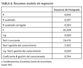 Este impacto de la gestión del conocimiento sobre las diversas actividades que se realizan al interior de las universidades se puede observar en los resultados de la regresión lineal simple. En efecto, en la Tabla 6 se encuentra un impacto directo y moderado (R = 0,630), además significativo (F = 30,309; p < 0,01). Asimismo, la gestión del conocimiento tiene la capacidad de explicar el 38,4% del comportamiento de la variable docencia de postgrado.