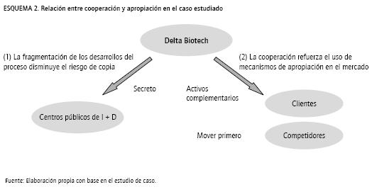 El esquema de cooperación público-privada al que recurre Delta Biotech S.A. para la fase de I + D de sus procesos innovadores, plantea situaciones que la misma considera para configurar su estrategia de apropiación. En el contexto de cooperación seguido por la firma pueden visualizarse dos conocimientos: el relativo a la secuencia completa de etapas y el implicito en cada etapa. La firma posee el primero, pero controla solo parcialmente el segundo, subcontratando partes del desarrollo, no en un solo lugar sino en distintos centros públicos de I + D como modo de proteger dicho conocimiento.