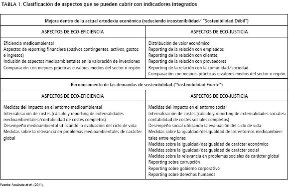 No obstante, es necesario que el conjunto de indicadores sea completo sobre las cuestiones que la sostenibilidad requiere y no se limite solo a aquellos aspectos que sean fácilmente controlables por la organización. En este sentido, la sostenibilidad al ser un concepto muy amplio puede enfocarse desde diferentes perspectivas. Siguiendo a Bebbington y Thomson (1996), en el reporting de sostenibilidad debemos considerar los dos extremos delimitados conocidos como Sostenibilidad Débil y Sostenibilidad Fuerte, en función de su aceptación del statu quo o la necesidad de cambiarlo, respectivamente. En esta linea Gray y Bebbington (1996) clasifican las diferentes técnicas de reporting social y medioambiental en función de su proximidad a las nociones de Sostenibilidad Fuerte o Sostenibilidad Débil y su alusión a aspectos de Eco-Eficiencia o Eco-Justicia. Con esta base, Azcárate et al. (2011) realizan un reparto análogo de las temáticas para las que los indicadores integrados pueden resultar de utilidad (ver Tabla 1).