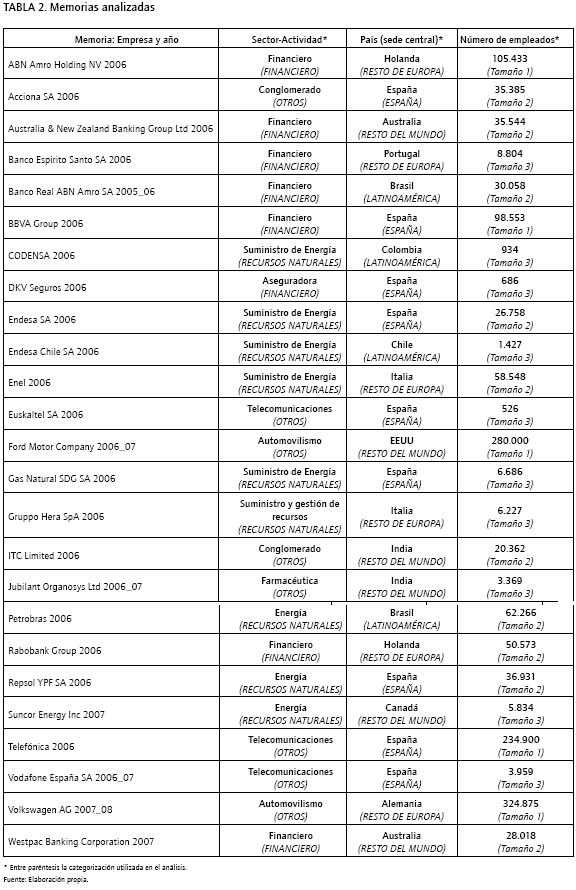 Por tanto, se seleccionan como memorias objeto de estudio aquellas que se considera que previsiblemente vayan a incluir un mayor desarrollo de indicadores integrados por ser las que tienen un mayor nivel de aplicación (distintivo A+ de GRI) y pueden ser consideradas como las mejores en la práctica (haber superado la primera fase de los premios de GRI). Con ello, el número total de memorias seleccionadas es de veinticinco. Las mismas se presentan en la Tabla 2, junto con los datos descriptivos utilizados en la exploración realizada en el trabajo.