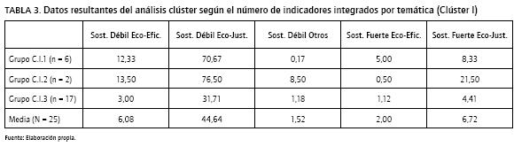 Para explorar las variables enunciadas en el apartado anterior se realizan tres análisis clúster independientes: (1) agrupación de memorias según el número de indicadores integrados por temática (Clúster I), (2) agrupación de memorias según el seguimiento de los indicadores integrados principales propuestos por GRI-G3 a través de las diferentes temáticas (Clúster II), y (3) agrupación de memorias en función del número de indicadores de Sostenibilidad Fuerte, del número de indicadores que vinculan la relación de la organización con el entorno (suma de los indicadores integrados sistémicos y combinados), del número de indicadores integrados diferentes a los propuestos por las iniciativas evaluadas (nuevos indicadores) y del grado de seguimiento de las iniciativas (Clúster III). A continuación, se presentan los resultados obtenidos en cada uno de ellos.