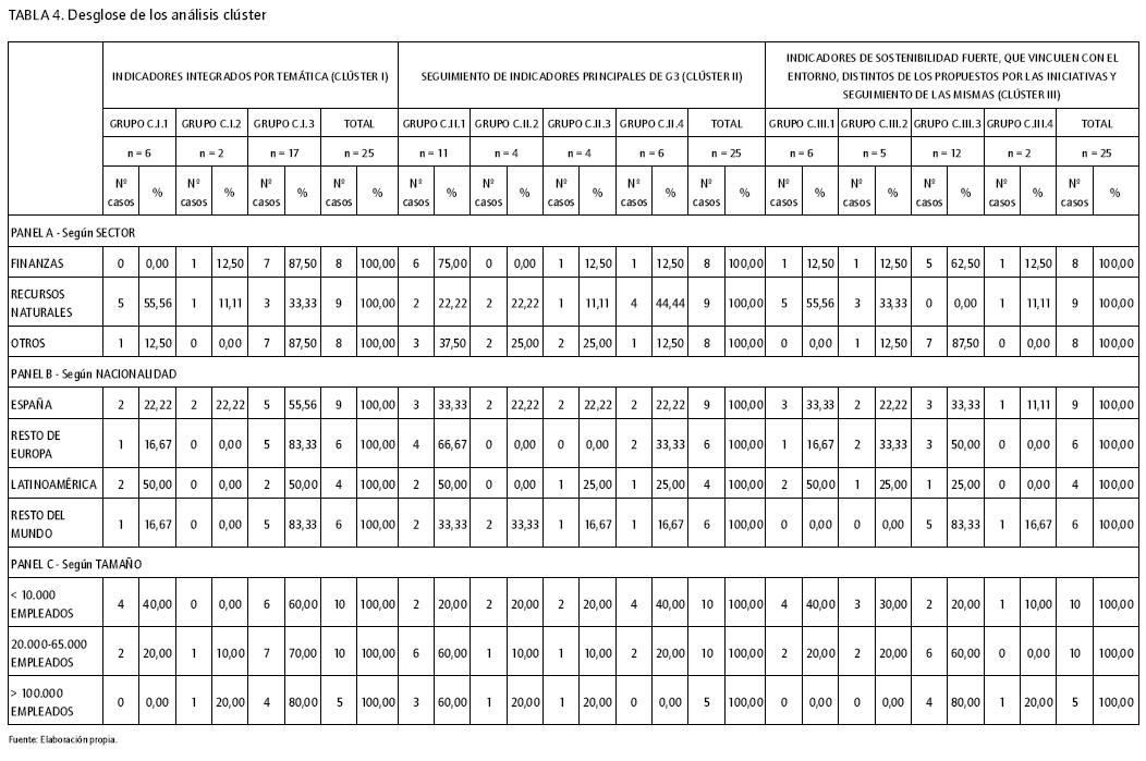 Sobre el tamaño de las empresas que elaboran las memorias (ver Tabla 4-Panel C) al igual que en los análisis clúster anteriores, es preciso destacar que las cuatro empresas más grandes se sitúan en el grupo C.III.3 de peores resultados.