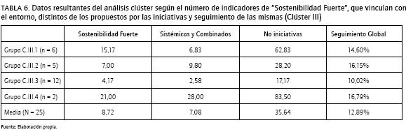 Finalmente se plantea un análisis clúster que combina diferentes aspectos del empleo de los indicadores integrados como son (a) la asunción de aspectos de gran calado, representado por el número total de indicadores de Sostenibilidad Fuerte (con independencia de si tratan aspectos de Eco-Eficiencia o Eco-Justicia); (b) el grado de sofisticación de los indicadores para que vinculen el desempeño de la empresa con el estado del entorno (suma de indicadores sistémicos y combinados); (c) la capacidad inventiva de la empresa medida con aquellos indicadores que no eran propuestos por las principales iniciativas internacionales (incluida la versión de 2002 de GRI), y (d) el grado de seguimiento de las mismas.