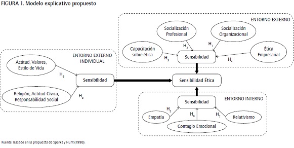 Con base en la revisión bibliográfica y la aclaración conceptual sobre sensibilidad ética, se diseña el modelo explicativo con las relaciones que derivan las hipótesis de investigación (ver Figura 1).