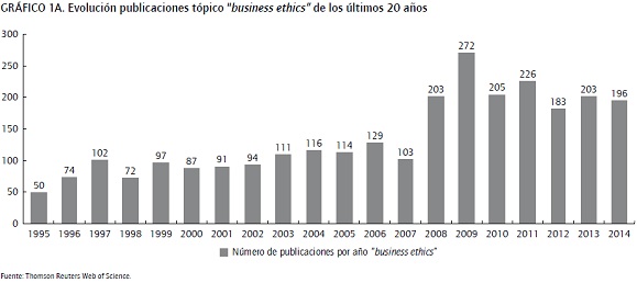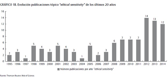 La evolución general de las publicaciones en relación a "Ética" durante los últimos veinte años nos muestra un progresivo auge, lo que motiva nuestro interés sobre el estudio de esta temática. El total de artículos sobre tópico ethics es de 42.320; de estos, 3.615 pertenecen a la temática business. Al analizar "business ethics" nos encontramos con 2.774 artículos, mostrándose un fuerte crecimiento el año 2009 (Gráfico 1A). Luego, se revisó el tema "ethical sensitivity" dado que es el enfoque de la investigación, en el que se observaron 108 artículos en total al finalizar el año 2014 (Gráfico 1B). Al verificar en el tópico general ethics, nos encontramos con 248 investigaciones en las que se involucra a Chile, pero ninguna analiza la sensibilidad ética. Más aún, no se encontraron publicaciones clasificadas sobre ethical sensitivity de origen latinoamericano, lo que nos motiva a investigar esta temática, dada su relevancia internacional y necesidad de mayor análisis en nuestra sociedad. Estos análisis se realizaron en la base de datos Thomson Reuters Web of Science (antes ISI Web of Knowledge).