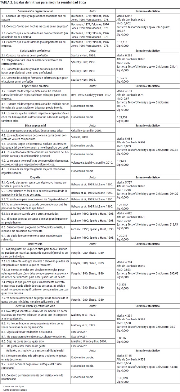 De los modelos revisados, destacamos las propuestas de Maloney, Ward y Braucht (1975), Buchanan (1974), Van Maanen (1976), Forsyth (1980), Bebeau, Rest y Yamoor (1985), Jones (1991), Rest (1986), Shaub (1989), Akaak y Riordan (1989), McBane (1990), Goolsby y Hunt (1992), Hunt y Vitell (1993), Akaak (1993), Sparks y Hunt (1998), Martínez, Grande y Fraj (2004), Grisaffe y Jaramillo (2007), Sullivan (2009) y Valenzuela, Mulki y Jaramillo (2010), de los cuales obtuvimos variables validadas para construir nuestra propuesta, que tiene como base el modelo planteado por Sparks y Hunt (1998), por ser el artículo con mayor citaciones en el tópico ethical sensivility.