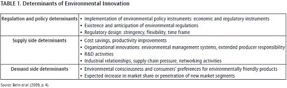 Belin, Horbach and Oltra (2009), try to establish regional characteristics of eco-innovation by analyzing the regulatory push/pull effect. They study, using German data, the influence of regulation activities of public administration on innovation. For French data they focus on the impact of innovation in the fulfilment of norms and regulation by companies. Their analysis shows that the normative role is highly relevant. However, the authors stress the threats of considering eco-innovation as a systematic answer to regulation. "The existence of this regulatory push/pull effect should not lead to consider eco-innovations as systematically induced by regulation, and so to under-estimate the role of supply and demand side determinants" (Belin et al., 2009, p. 5). From their point of view, other factors determine the response of a company to new regulation (Table 1).
