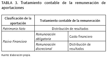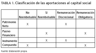 Las aportaciones de los socios al capital social, tal y como se ha comentado anteriormente, tienen dos atributos claves para su calificación como patrimonio neto o pasivo: su remuneración y su posible reembolso. Basándose en estas dos características y por combinación de ambas, las Normas sobre aspectos contables de las sociedades cooperativas españolas las dividen en tres bloques (clasificación recogida en la Tabla 1):