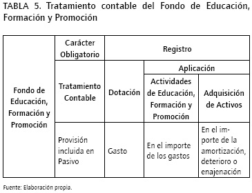 En la Tabla 5 se recoge el tratamiento establecido por la normativa contable para el Fondo de Educación, Formación y Promoción.