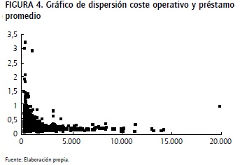 En primer lugar, al igual que en el caso de las economías de escala, se estudia la posible relación entre el monto promedio prestado y el coste operativo, pues es frecuente considerar que los préstamos más pequeños representan costes mayores, pudiéndose comprometer la rentabilidad de la institución. La Tabla 8 mostraba la esperada correlación negativa, aunque no demasiado acusada, entre préstamo promedio (en sus dos versiones) y coste operativo.