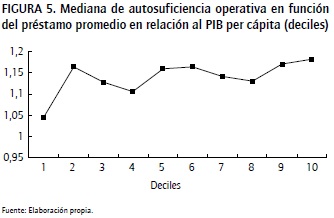 Por otra parte, y más allá de los costes, la Figura 5 estudia la relación entre los menores montos y la rentabilidad, que se verá influida por los costes operativos, pero también por otros factores. Para ello, se representa la evolución de la rentabilidad central (mediana) de cada grupo, midiéndola a través de la autosuficiencia operativa (los resultados son muy similares si tomamos ROA o ROE).