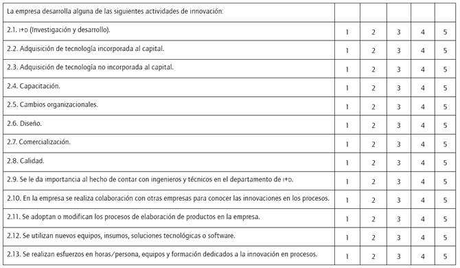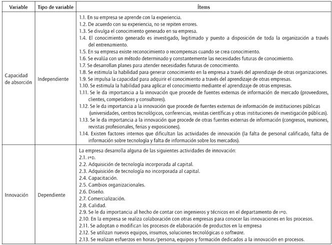 Por esta razón, se diseñaron 14 ítems para medir la CAPAB y 13 ítems para medir la innovación. Dichos ítems fueron elaborados en un formato tipo Likert, con cinco puntos de asignación de respuesta donde 5 significó "totalmente de acuerdo" y 1 "totalmente en desacuerdo". En la tabla 3 se expone el detalle de los ítems utilizados para cada una de las variables de estudio.