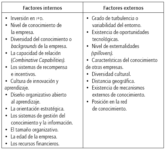 De acuerdo con Laurentiu (2010), son tres los principales elementos que componen la CAPAB: la de macroeconómica, la de gestión administrativa y la de absorción financiera. Derivado de lo anterior, otros autores han analizado la relación de la CAPAB con la generación de ventajas competitivas y, en este aspecto, Forés y Camisón (2008) resaltaron la importancia del desarrollo de dicha capacidad para la creación o el sustento de ventajas competitivas empresariales, y revisaron los principales factores determinantes internos y externos (tabla 1).