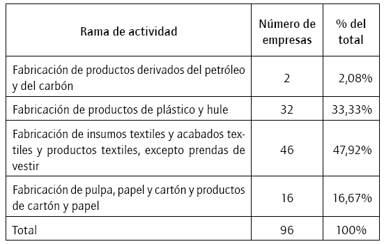 En este sentido, se identificó como universo de estudio 127 empresas que pertenecen a los sectores de extracción de petróleo y gas e industria química y de productos derivados del petróleo, en el municipio de Reynosa, Tamaulipas, de acuerdo con los datos obtenidos en el Directorio Estadístico Nacional de Unidades Económicas (INECI, 2014). Para la determinación de la muestra se utilizó el muestreo pro-babilístico aleatorio, determinando así una muestra de 96 empresas, considerando un nivel de confianza del 95% y un margen de error del 5%. La tabla 2 presenta la distribución de la muestra utilizada.
