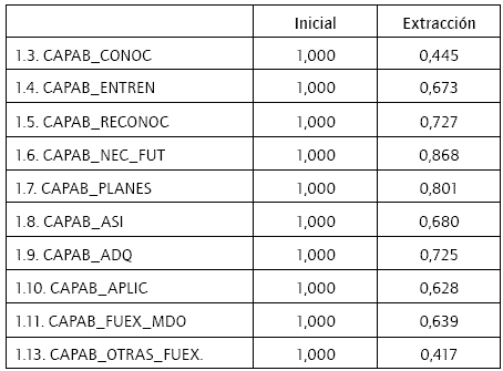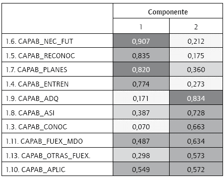 Una vez obtenidas las dos dimensiones que integran la variable CAPAB, se procedió al análisis de fiabilidad de cada una de ellas, mediante la aplicación del coeficiente alfa de Cronbach. La confiabilidad de la primera dimensión es de 0,900 y de la segunda, de 0,836. Como se puede observar, las dos dimensiones sobrepasan el valor mínimo aceptable de 0,70 (Nunally y Bernstein, 1994).